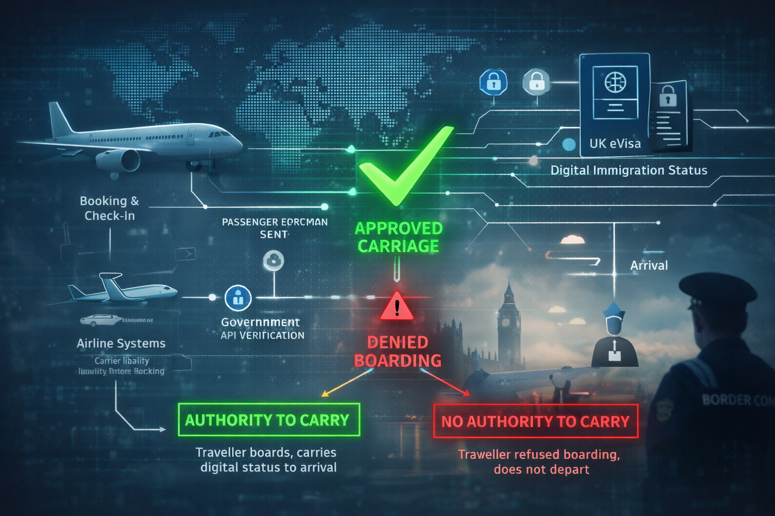Airlines are now required to confirm immigration status before a passenger boards. Rather than inspecting a visa, the carrier submits passenger information and receives a boarding instruction from the government system. The response determines whether the journey can begin. If authorisation is not returned, the traveller never reaches the physical border.
